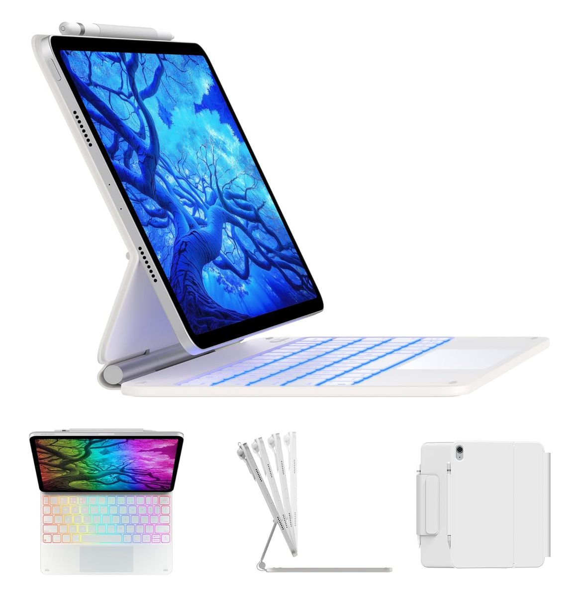 Backlit Keyboard with Shortcuts: The keyboard features 10 backlight colors with 3 brightness levels, ergonomic keys, and a full row of iPadOS shortcuts for adjusting brightness, media controls, and more, enabling comfortable and efficient typing even in low-light conditions.